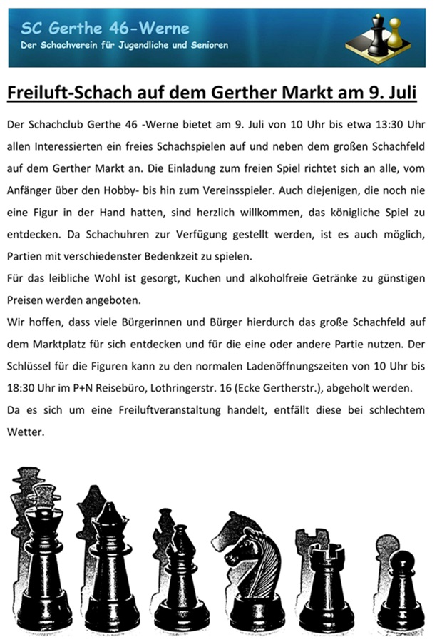 Am 25. Juni (Gerther Sommer) und am 9. Juli bieten wir am Großschachfeld auf dem Gerther Markt (siehe Karte am Ende des Beitrags) ein Freies Spiel für alle Interessierten – von Neulingen bis zum Vereinsspieler – an. Am ersten Termin gibt es im Rahmen des Stadtteilfestes neben einem Bühnenprogramm und anderen Aktivitäten auch etwas für das leibliche Wohl, am zweiten bieten wir selbst Getränke und Kuchen an. Weitere Informationen stehen im angehängten Flyer, der auch schon in Gerthe rund um den Marktplatz verteilt wurde und zudem als PDF zum Download bereit steht.