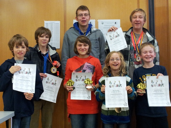 Das Turnier konnte Christin Pflieger mit 6½ Punkten gewinnen. Sie spielte Unentschieden gegen den favorisierten Martin Baldszun von der SG Witten und konnte alle anderen Partien gewinnen. Damit ist sie natürlich auch Siegerin in der U18. Des Weiteren gewann sie den Pokal "Bestes Mädchen". Yannis Kalle erreichte in der U16 mit 5 Punkten den 3. Platz (Gesamtwertung Platz 8). Er musste leider in der vorletzten Runde eine unglückliche Niederlage einstecken, als er mit sehr großem Materialvorteil die Zeit überschritt, obwohl er eigentlich die ganze Partie über die bessere Zeit besessen hatte. In der U14 stellten wir die Plätze 2 und 3. Oskar Zielinski (gesamt 7.) und Robin Wüllner (gesamt 9.) erzielten ebenfalls 5 Punkte. Auf dieselbe Punktzahl kamen auch Mika Kowalski und Jannik Biermann. Für Mika bedeutete dies den 3. Platz in der U12 (gesamt 13.) und Jannik wurde Sieger in der U10 (gesamt 12.) . In der U9 verpasste Dennik Finke das Treppchen nur knapp. Er wurde mit 3 Punkten Vierter (gesamt 38.).