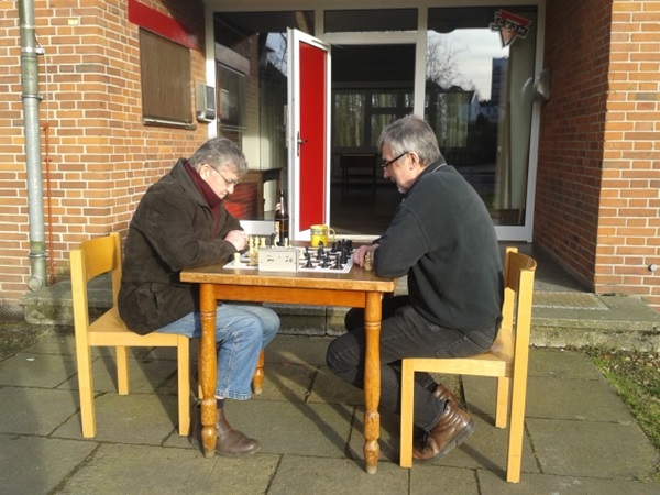 Da unser Gegner mit nur 5 Spielern antrat – Christin, Robin und Falk gewannen kampflos – gingen wir direkt mit 3:0 in Führung. Janusch hatte sein Spiel diesmal sehr solide angelegt, sein Gegner tauschte mit Weiß einige Figuren und bot Remis an, das Janusch dann auch akzeptierte. Mein Gegner wählte die Pirc-Verteidigung, ich wählte als Basisaufbau ein System mit Lc1-e3 und f2-f3. Nach meinem Angriff am Königsflügel setzte der Gegner ungenau fort und verlor durch eine Kombination einen Bauern. Nach weiteren ungenauen Zügen in schwieriger Stellung verlor er die Qualität sowie weitere Bauern und gab auf. Auch Yannis hatte in der Eröffnung einen Bauern gewonnen, den der Gegner jedoch hätte zurückerobern können. Stattdessen erreichte Yannis eine vorteilhafte Stellung, die er dann nach Zeitüberschreitung in einen Sieg umwandelte. Bernd wehrte durch Damentausch einen Königsangriff des Gegners ab und ging mit einem Mehrbauern in ein wahrscheinlich gewonnenes Endspiel. Nach einer ungenauen Fortsetzung konnte sein Gegner in ein Turmendspiel mit Minusbauern abwickeln. Da das Spiel nicht zu gewinnen war, einigte man sich auf Remis. Albin hatte eine ausgeglichene Stellung aus der Eröffnung erreicht und lehnte das Remisangebot des Gegners ab. Nach ein paar ungenauen Zügen musste er die Qualität für einen Bauern geben. In diesem leicht schlechteren Endspiel überlistete er seinen Gegner, so dass er einen Freibauern zur Dame verwandeln konnte. Daraufhin gab sein Gegner die Partie auf.
